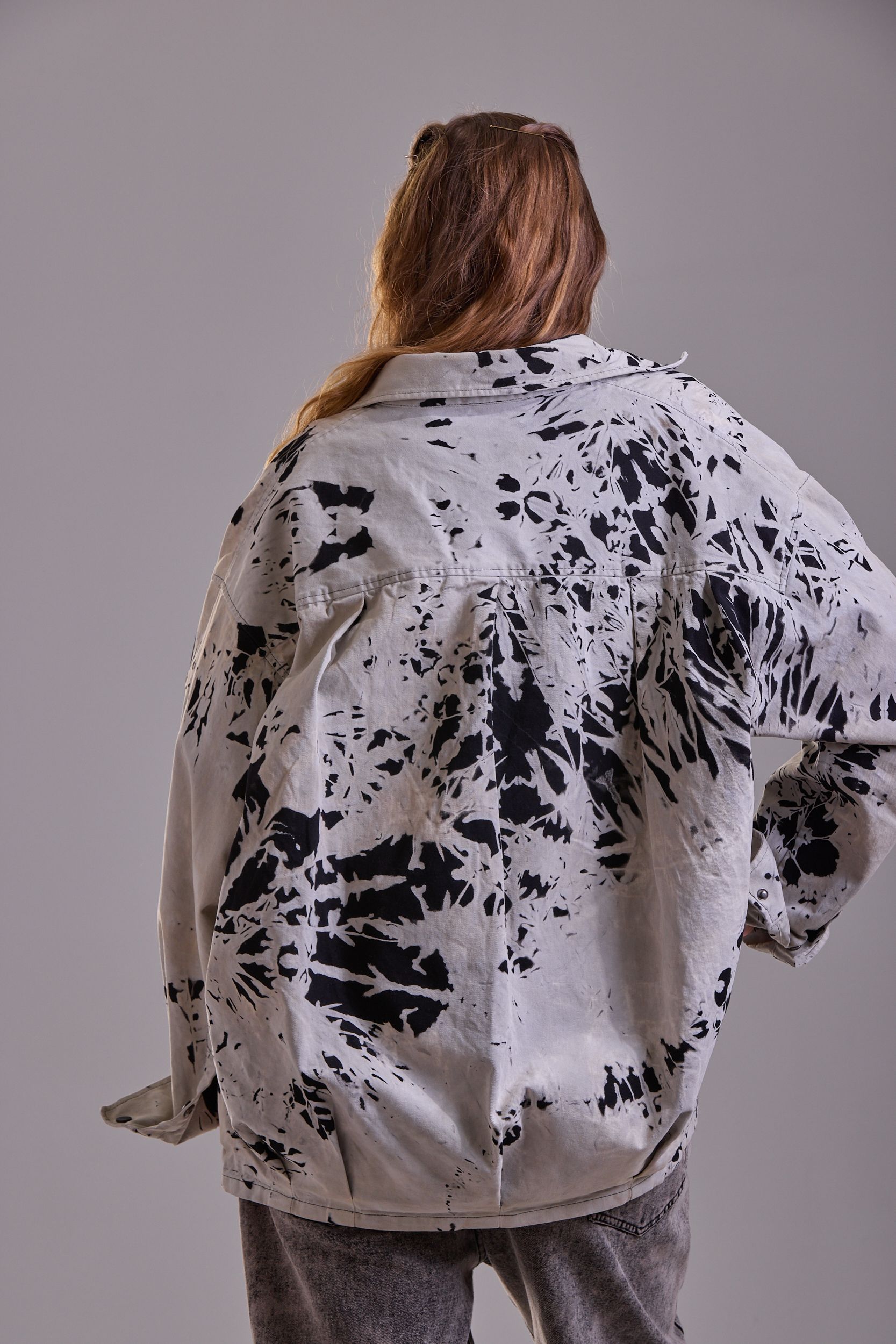 Сегодня мы продолжаем показывать, как вытравка может интересно смотреться на разных вещах. На этот раз мы поработали с белой рубашкой: окрасили ее в черный цвет, с помощью техники тайдай связали и сделали вытравку. Получился такой интересный декоративный эффект.